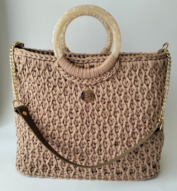 Jej subtelny, karmelowo-beżowy odcień i wyjątkowy, ręcznie wykonany splot tworzą harmonijną całość, która przyciąga spojrzenia. Charakterystyczne okrągłe uchwyty dodają jej lekkości i oryginalności, a złote detale podkreślają kobiecy, ponadczasowy charakter.